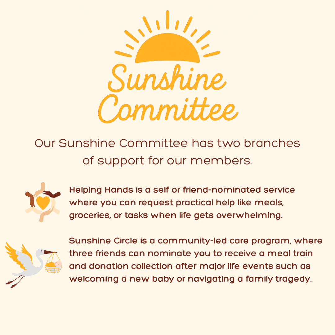 We know that motherhood is full of big moments! Joyful ones (like new babies!) and tough ones (like illness, loss, or surgery). It’s also full of lots of little moments that can sometimes feel overwhelming. That’s where our Sunshine Committee comes in! As the philanthropic arm our non-profit, we’re here to help our community show up for one another when it matters most. Through Helping Hands, you can request for support with meals, groceries, or everyday tasks. And through Sunshine Circle, three friends can nominate a mama to receive a meal train and donation collection during life’s biggest transitions. To be part of this amazing community, whether you’d like to help or may need support yourself, please be sure to add our Facebook page, NFW Littles Sunshine.
