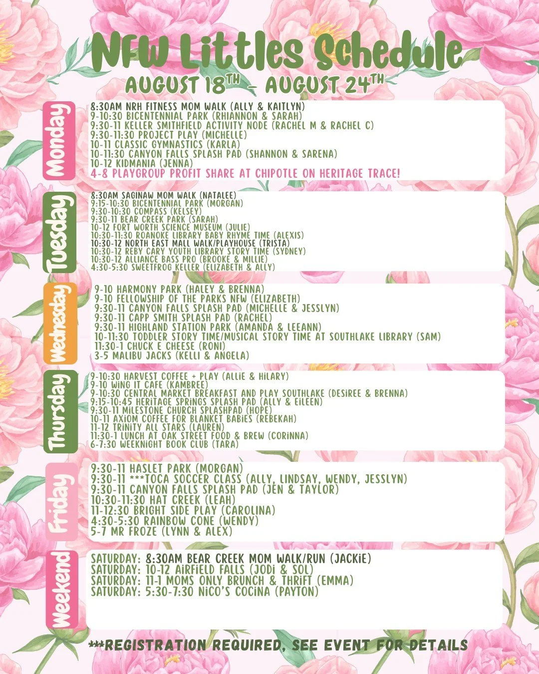 Every Sunday, we post the schedule for the upcoming week! It’s a simple overview of all the fun happening, so you know what’s ahead. A lead will share it using the “@everyone” tag, and you can always find it later in the “Featured” section at the top of our main page.